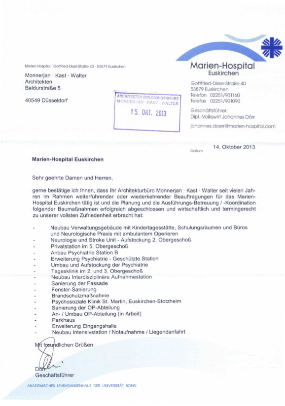 Durch die konsequente Anpassung der baulichen Gegebenheiten wurden die internen Prozessabläufe immer weiter optimiert und den gewandelten medizinischen Anforderungen angepasst, so dass sich das Marien-Hospital Euskirchen heute als zukunftsfähiges Krankenhaus erfolgreich am Markt behauptet. Die Bauherrenzufriedenheit zeigt sich auch im entsprechenden Referenzschreiben.