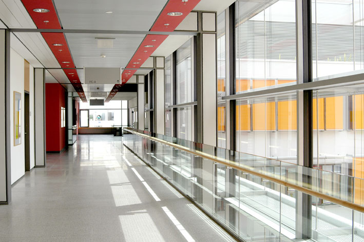 Im Vordergrund der Gestaltung steht der hochwertige Aufenthalts- und Arbeitsraum, dessen Qualität nicht nur von der Erscheinung der Wände, Decken und Böden abhängt, sondern auch von den nicht greifbaren und dennoch ganz konkreten Dimensionen wie Licht, Schatten, natürlichem Luftwechsel und dem Ausblick in den Landschaftsraum. Die lichtdurchflutete Magistrale ist durch das Wechselspiel zwischen Innenhöfen und attraktiv gestalteten Leitstellen vor den Kliniken und Instituten gegliedert. Ihre natürliche Be- und Entlüftung durch großzügige Lüftungselemente in Querrichtung trägt zu einer betriebswirtschaftlichen Einsparung von Energiekosten bei. Außenliegende Sonnenschutzelemente und der vorgelagerte, adiabat kühlende See schützen vor Überhitzung im Sommer. Im Winter ermöglichen die Glasflächen auf der Südseite passive solare Energiegewinne. Die zahlreichen und vielfältigen Pflanzen in der Magistrale schaffen eine wintergartenähnliche Atmosphäre und tragen durch ihre Sauerstoffanreicherung zu einer hohen Aufenthaltsqualität bei.