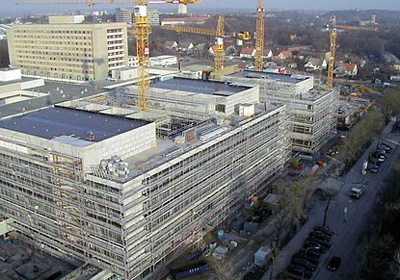 Die Neubauten bieten dem gesamten Quartier eine klare städtebauliche Neuordnung in Form eines Gesamtensembles und schaffen eine eigenständige architektonische Identität mit freundlichem und einladendem Charakter. Die sanfte Höhenentwicklung, ausgeprägte Gliederung der Baumassen und Vernetzung mit dem Landschaftsraum sind die wesentlichen Grundzüge der offenen Gesamtkomposition. Trotz klarer Ordnung wurde keine finite Großform, sondern eine entwicklungsfähige, lebendige Struktur mit menschlichem Maßstab entworfen. Die Altbausubstanz wird funktional mit kurzen Wegen eingebunden. Das zentral verbindende Element zwischen äußerlich unangetasteter - und damit während der Bauzeit voll funktionsfähiger Altbausubstanz - und der Neubaumaßnahme ist die neue leicht und transparent gestaltete Magistrale. Im Westen weist ihr weitausladendes Vordach signifikant den Haupteingang für den Publikumsverkehr aus. Im Osten bindet sie die Forschungs- und Lehrgebäude an das Klinikum an. Weithin sichtbar orientiert sich der ebenerdige Haupteingang zum Hubertusplatz mit der großen Haltestelle des öffentlichen Nahverkehrs. Von hier aus entwickelt sich die Magistrale als Hauptbewegungsachse zwischen den bestehenden Gebäuden, den klinischen Zentren und medizinischen Einrichtungen der Neubauten (23 OP-Räume, Intensivpflege und Bereiche für Forschung und Lehre).